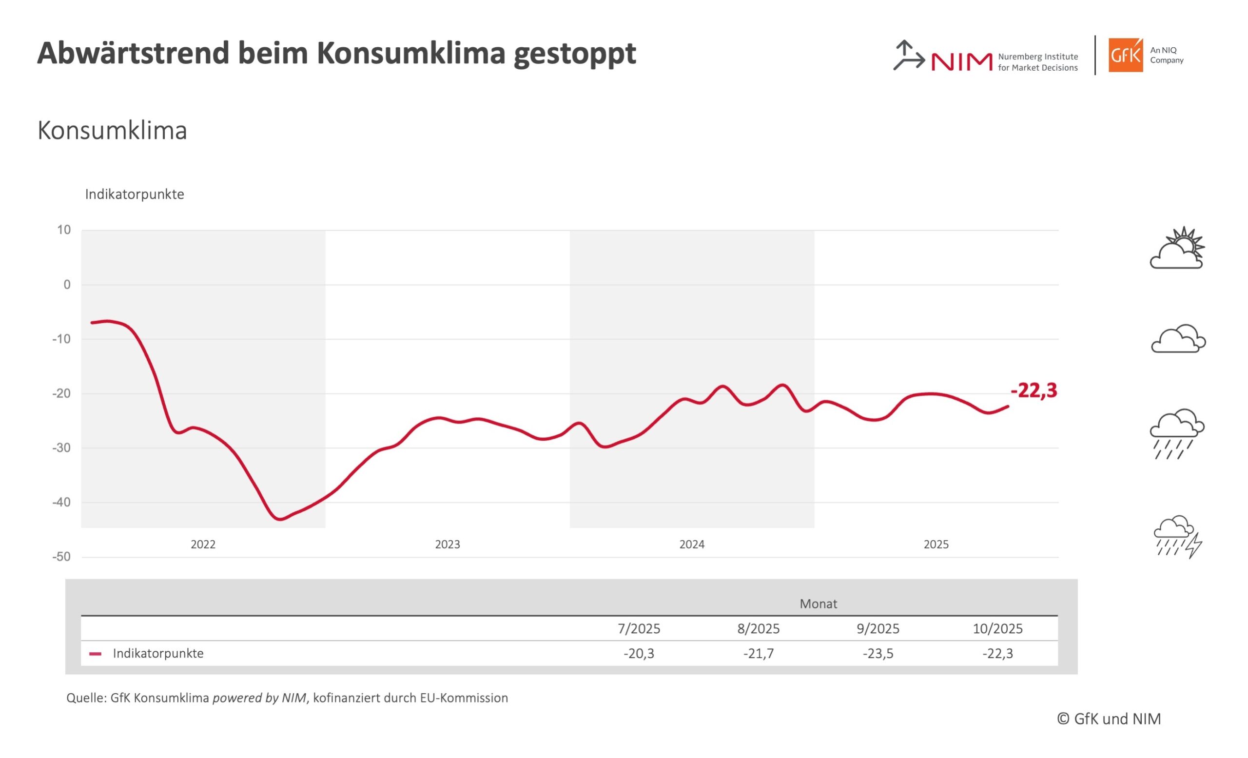 Folglich prognostiziert der Konsumklima-Indikator für Oktober 2025 im Vergleich zum Vormonat einen Anstieg um 1,2 Zähler auf -22,3 Punkte – so die Ergebnisse des GfK Konsumklimas, das seit Oktober 2023 gemeinsam von NIQ/GfK und dem Nürnberg Institut für Marktentscheidungen (NIM), herausgegeben wird.